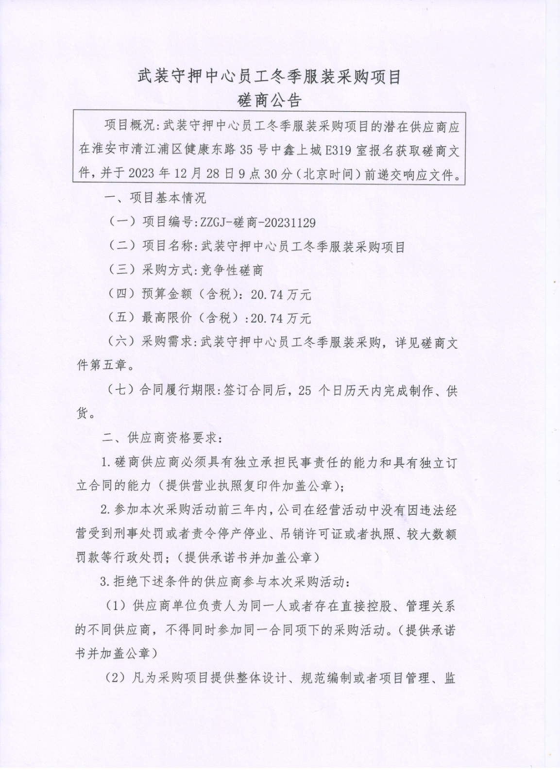武裝守押中心員工冬季服裝采購項目磋商公告